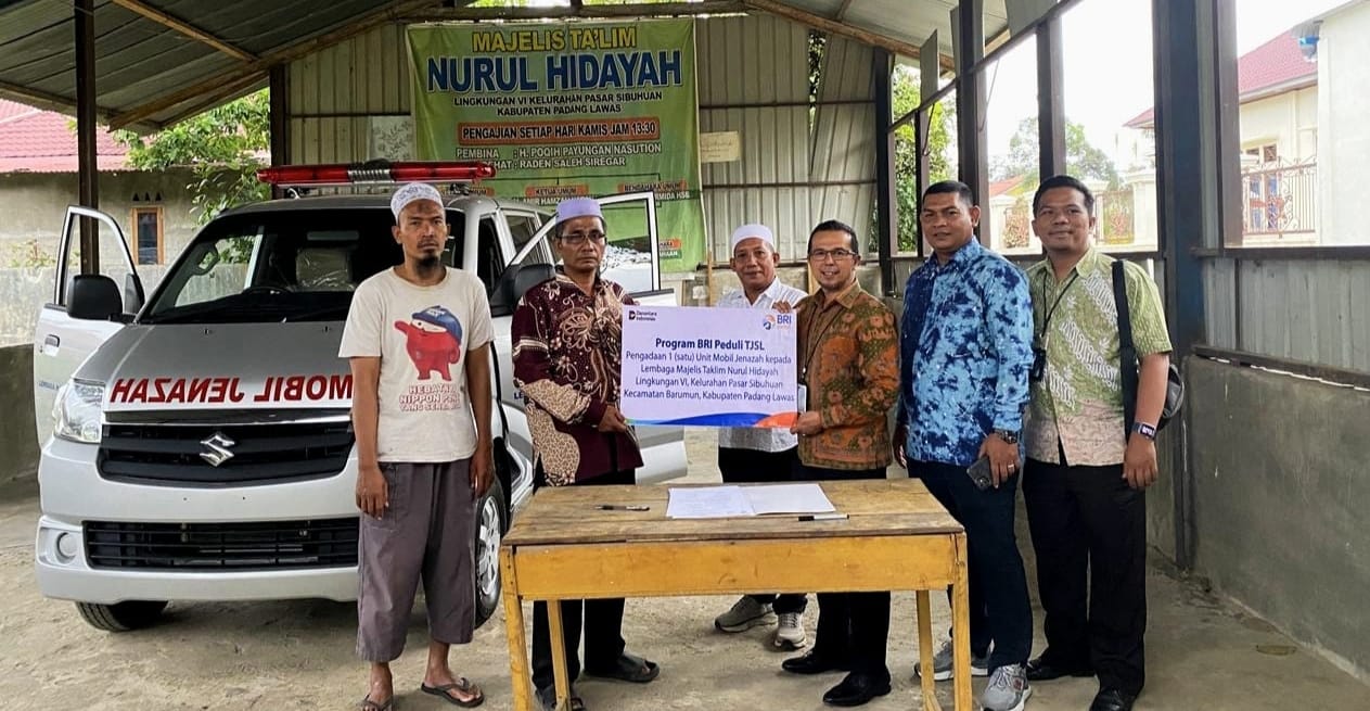 Secara simbolis,Pimpinan Cabang BRI Sibuhuan,Dedi Harpian,As,menyerahkan satu unit mobil jenazah kepada pengurus Lembaga Majelis Taklim Nurul Hidayah,Kecamatan Barumun, Kamis(18/12/2025),dihalaman lembaga majelis taklim tersebut.