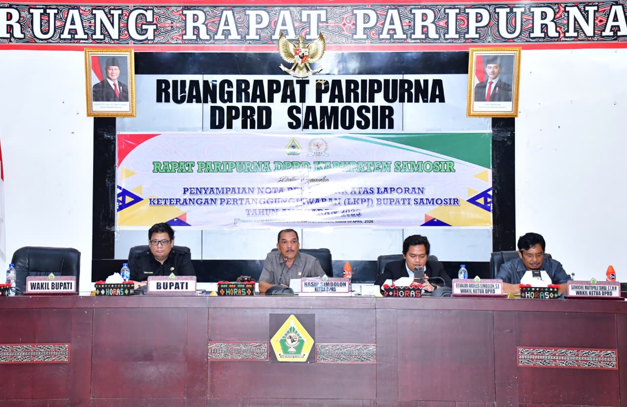 Bupati Samosir menyampaikan Nota Pengantar Laporan Keterangan Pertanggungjawaban (LKPJ) Tahun Anggaran 2025 dalam rapat paripurna DPRD Kabupaten Samosir yang digelar di Gedung DPRD, 09/04/2026.