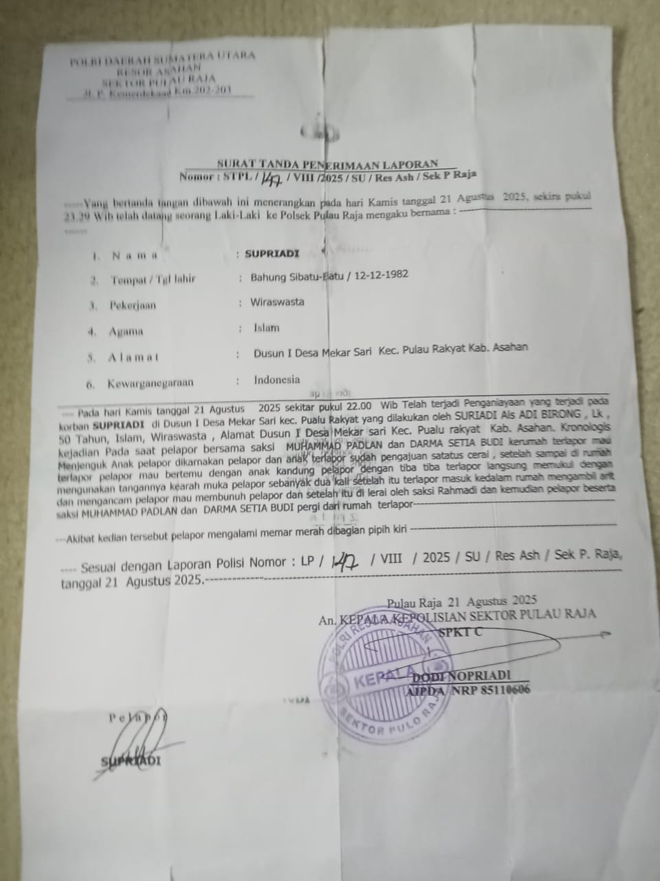 Kasus penganiayaan dan pengancaman pembunuhan itu telah dilaporkan Supriadi selaku korban ke Polsek Pulau Raja dengan surat bukti Laporan Polisi Nomor : LP /147/ VIII/2025/SU/Res Ash/Sek.P.Raja, tanggal 21 Agustus 2025.