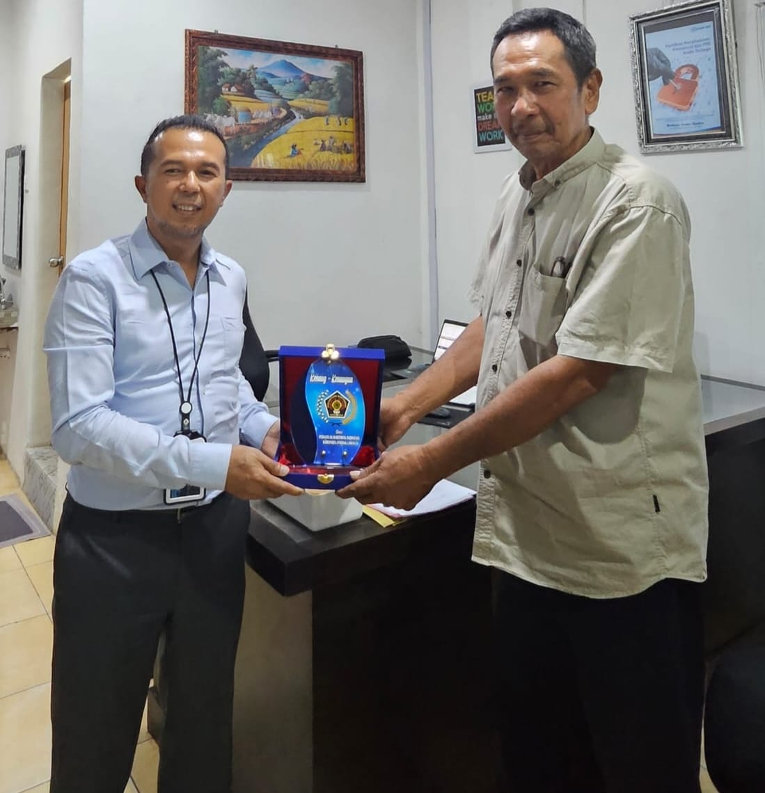 Penyerahan cendramata secara simbolis diberikan sebagai bentuk sinergitas mitra kerja pers dalam wujud penyebaran informasi.